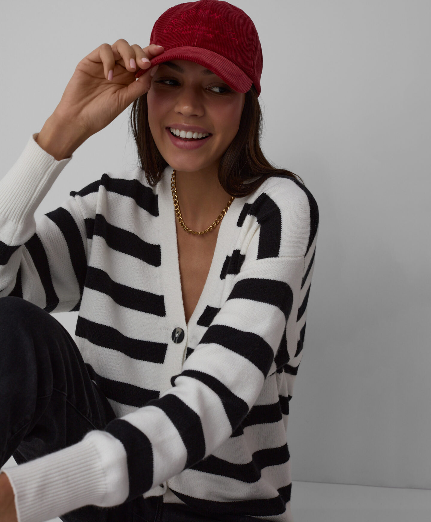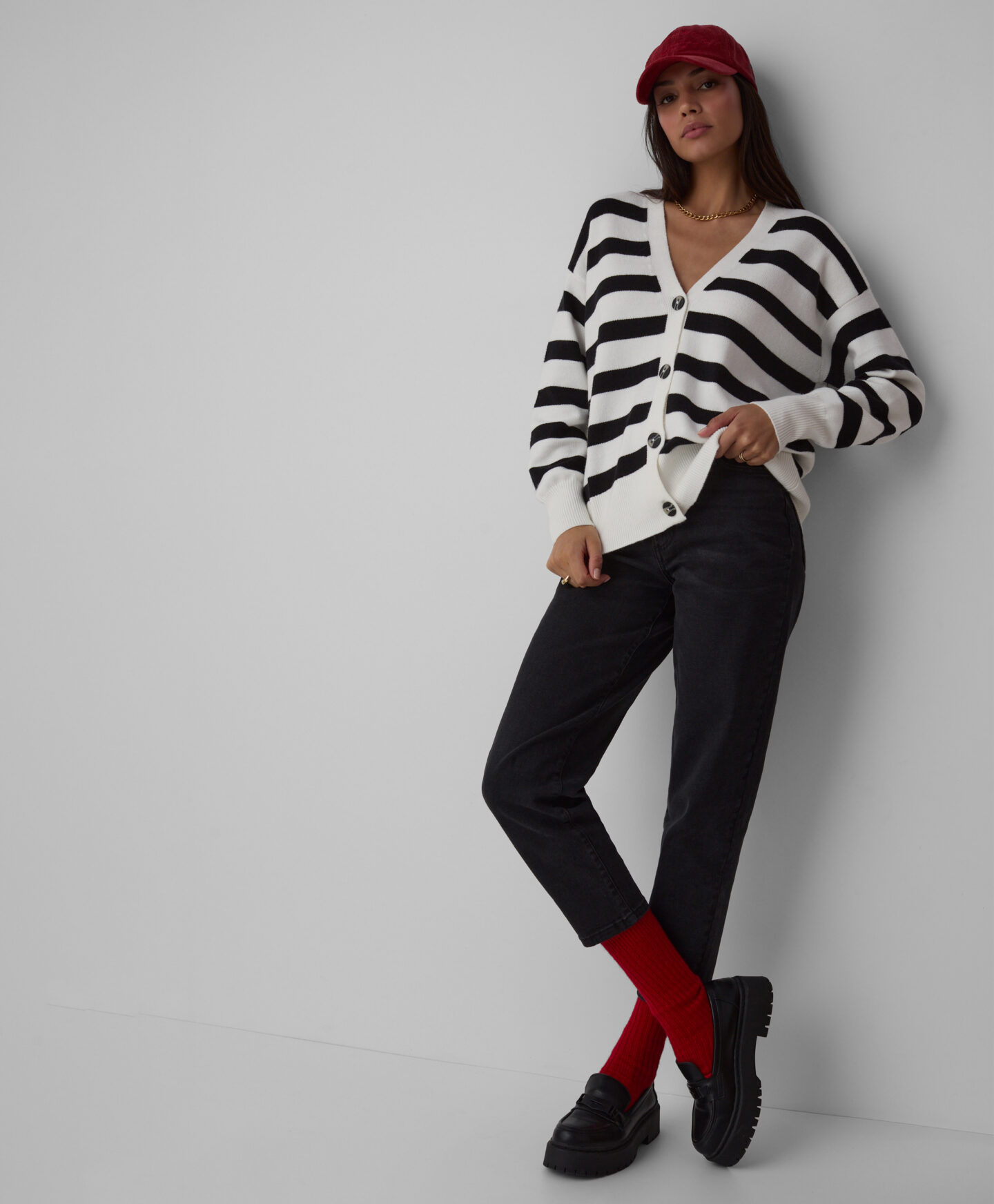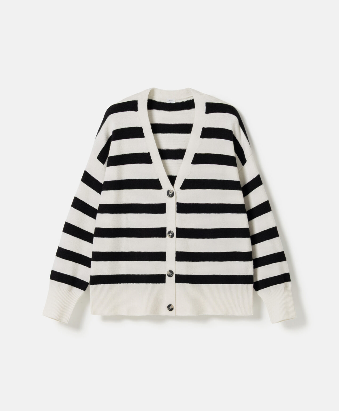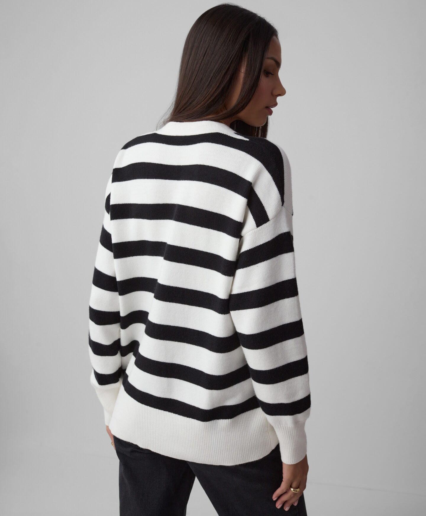 Ženska vesta s crno-bijelim prugama i širokog kroja savršen je odabir za ljubiteljice udobnih modnih klasika. Prugasti motiv nikada ne izlazi iz mode i izgleda odlično uz elegantne hlače i klasične traperice. Mekani materijal s viskozom nježno obavija kožu i pruža toplinu tijekom hladnih zimskih dana. Dostupna je u dvije boje.