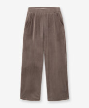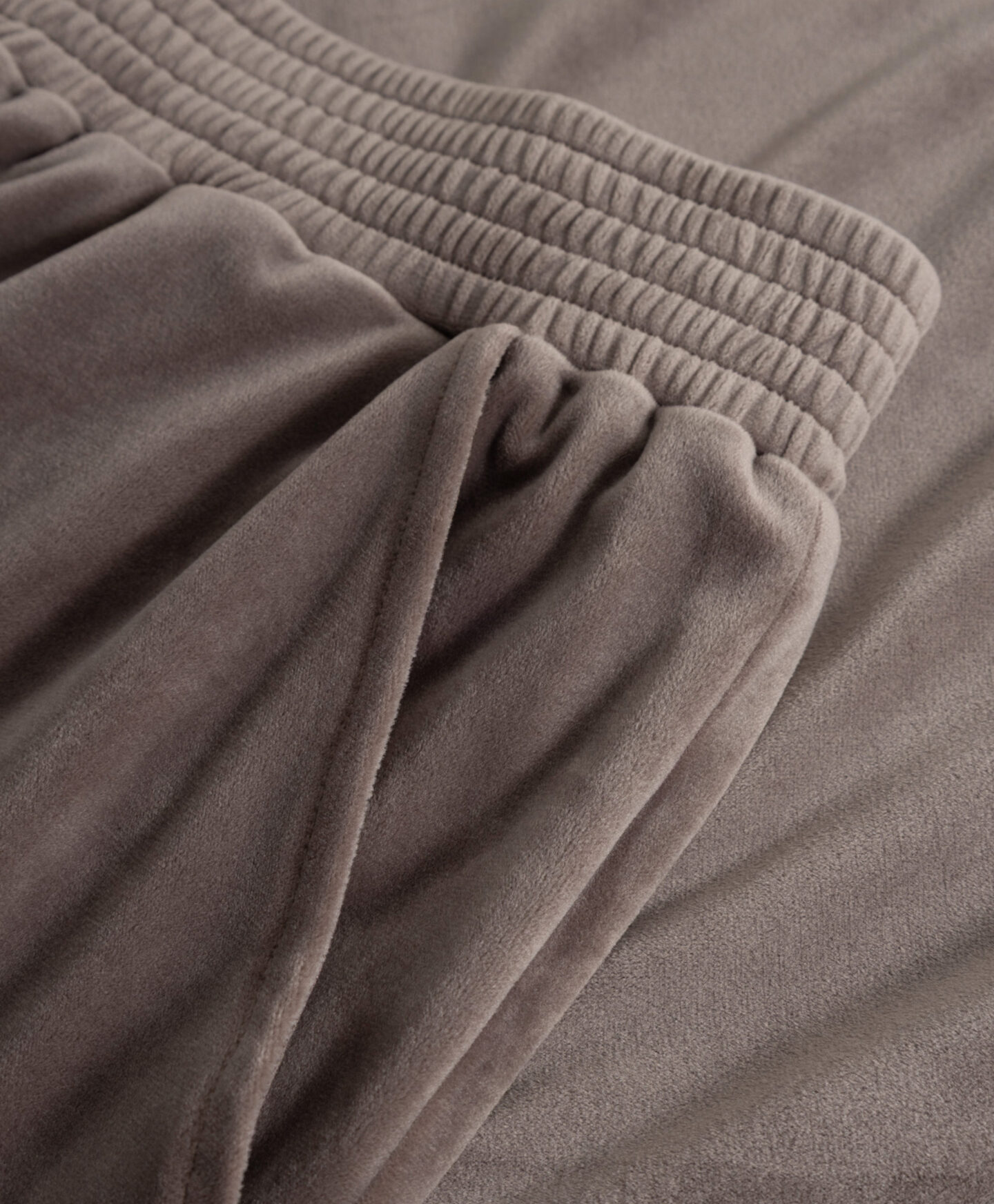 Smeđi ženski donji dio trenirke od velura spaja eleganciju i jednostavnost. Široke nogavice ne samo da pružaju potpunu slobodu pokreta, već i vizualno izdužuju noge i daju dozu profinjenosti odjevnoj kombinaciji. Nježna elastična traka u struku osigurava savršeno pristajanje.