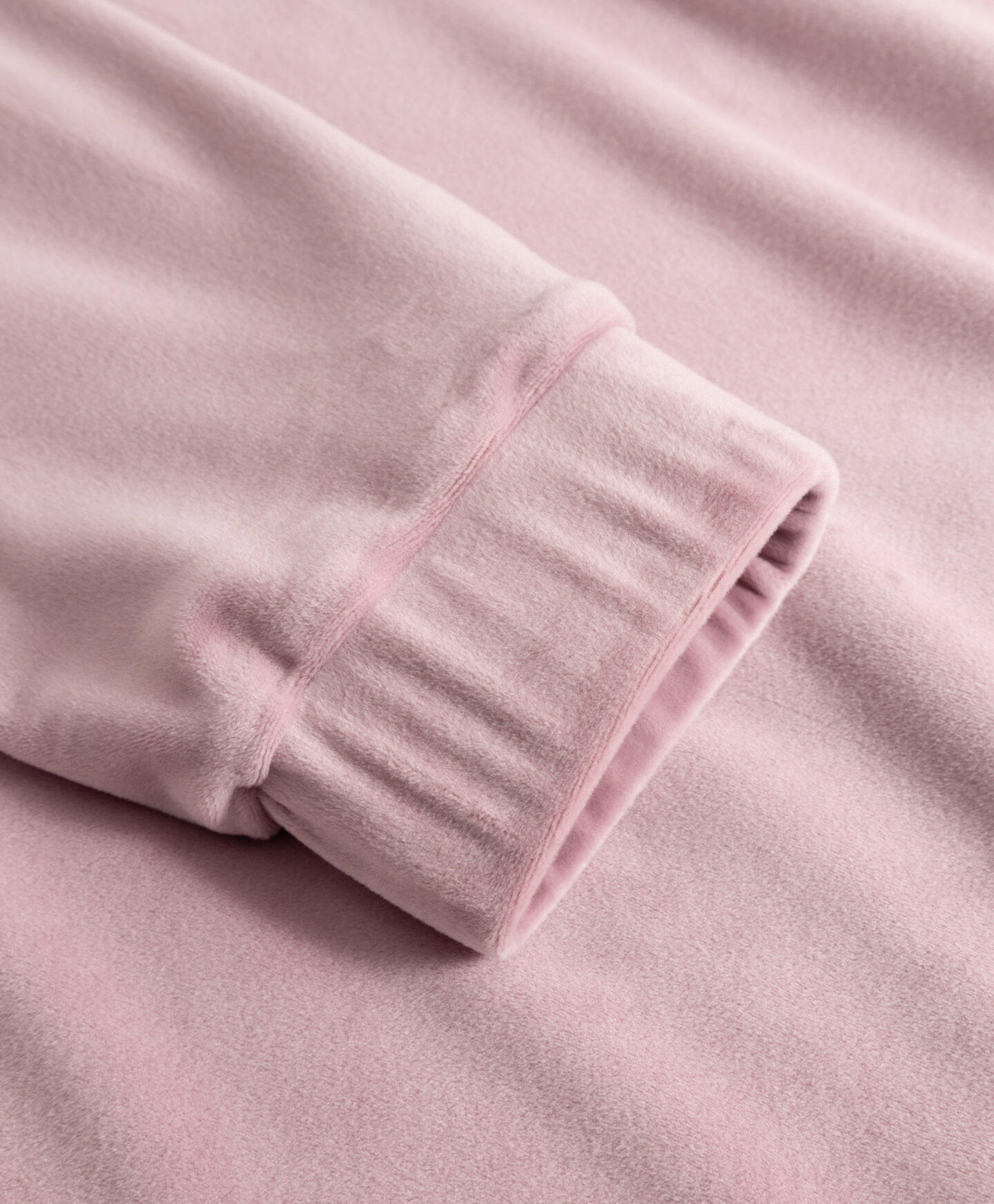 Ružičasti ženski gornji dio trenirke od velura s patentnim zatvaračem savršen je za žene koje žele izgledati elegantno i kod kuće i u opuštenim prigodama. Velur je nevjerojatno nježan prema koži, ne gužva se i lijepo pada. Funkcionalni patentni zatvarač omogućuje brzu promjenu stila – možete ga nositi zakopčanog kao klasični gornji dio trenirke ili otkopčanog preko majice za sportsko-elegantni izgled.