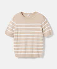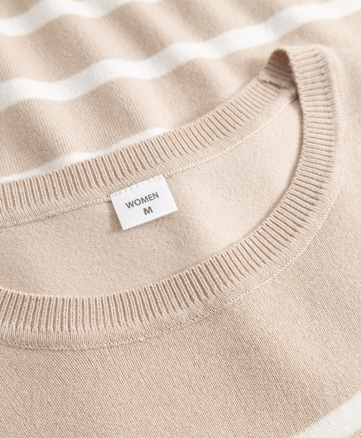 Bež ženski pulover od viskoze neophodan je odjevni komad u svakom ormaru ove sezone. Klasičan motiv pruga i neutralne boje čine ga savršenim izborom i za opuštene i elegantne odjevne kombinacije.