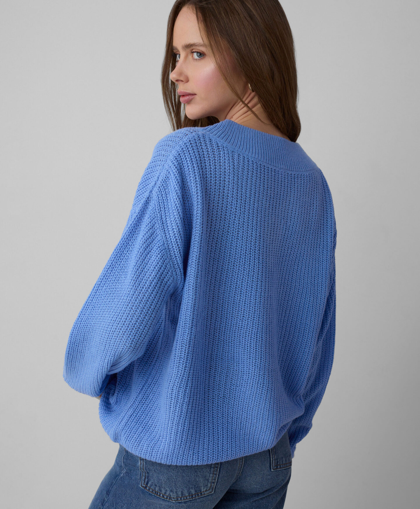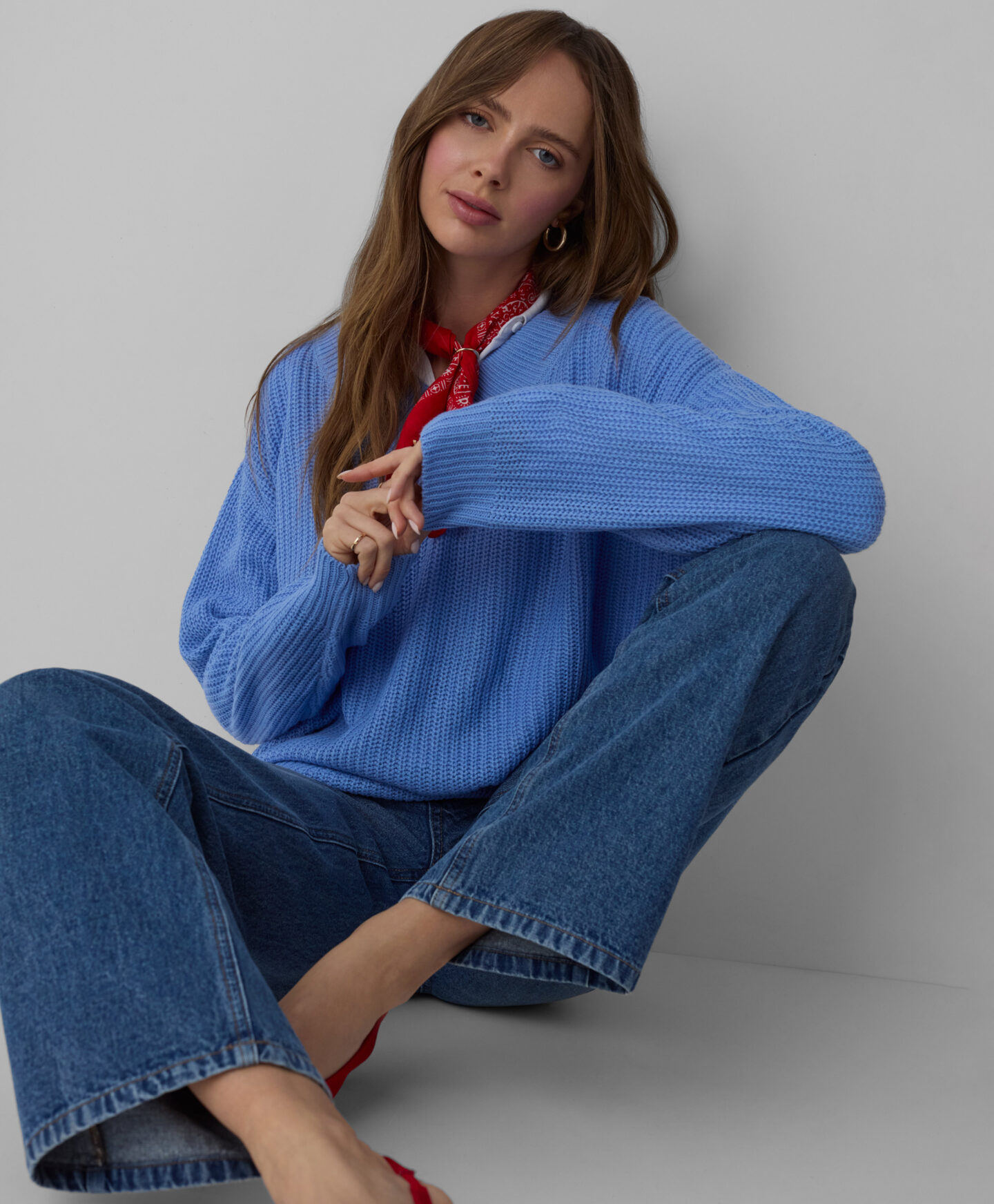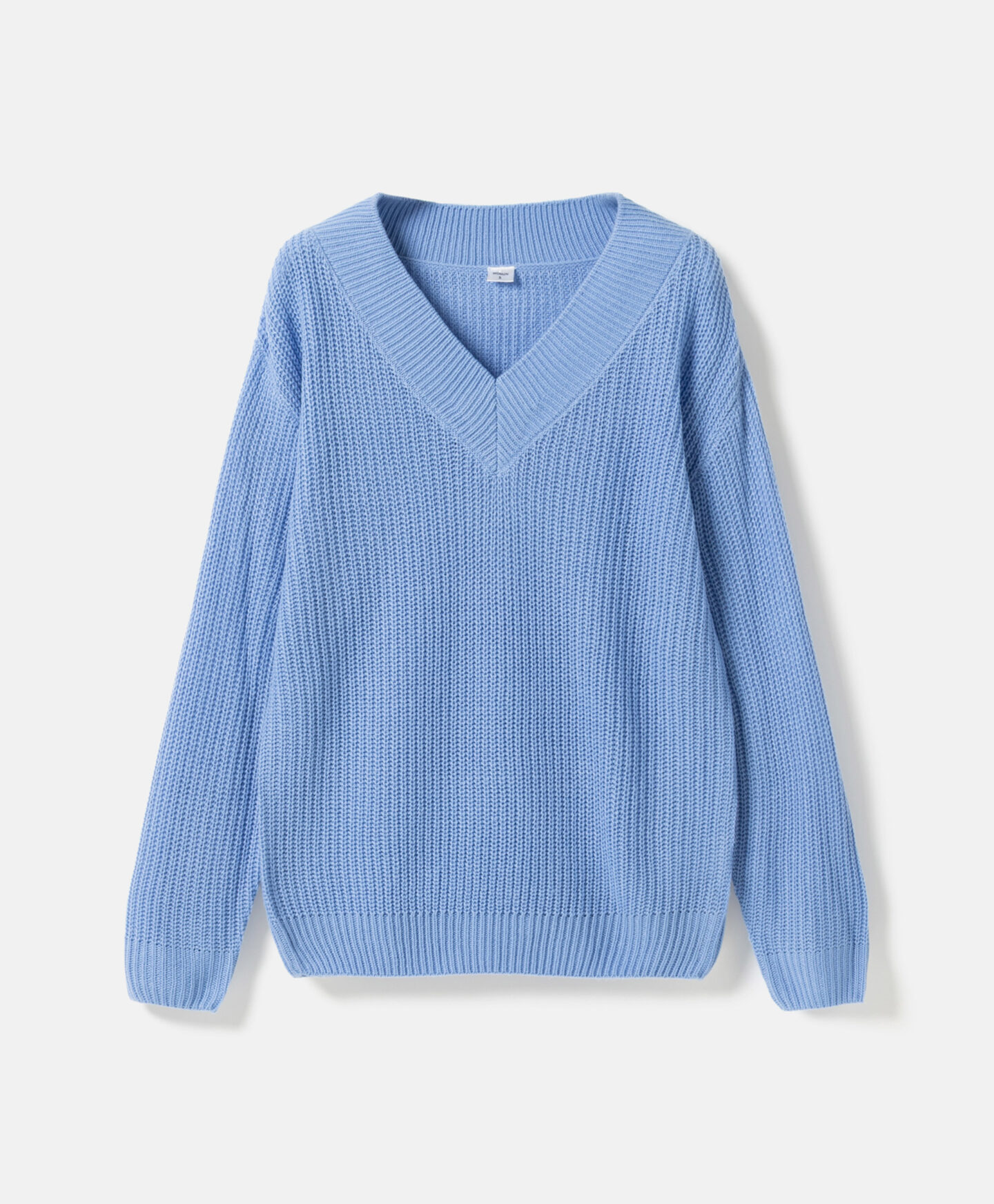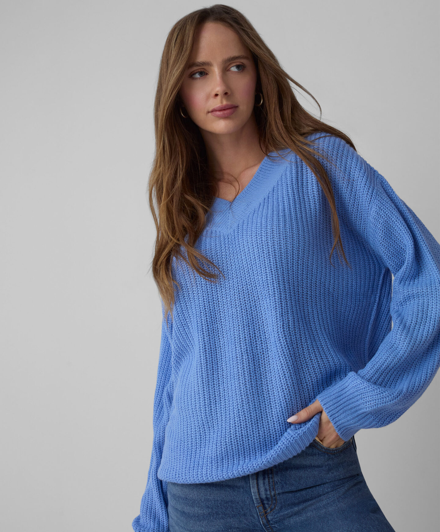 Plavi ženski pulover s V izrezom savršen je za svaki dan. Odličan je izbor za nošenje preko majice kratkih rukava ili elegantne košulje. V izrez naglašava dekolte i vizualno izdužuje vrat, dok pletivo čini svaku odjevnu kombinaciju posebnom. Pulover je topao, mekan i vrlo ženstven. Na izbor između dva motiva.