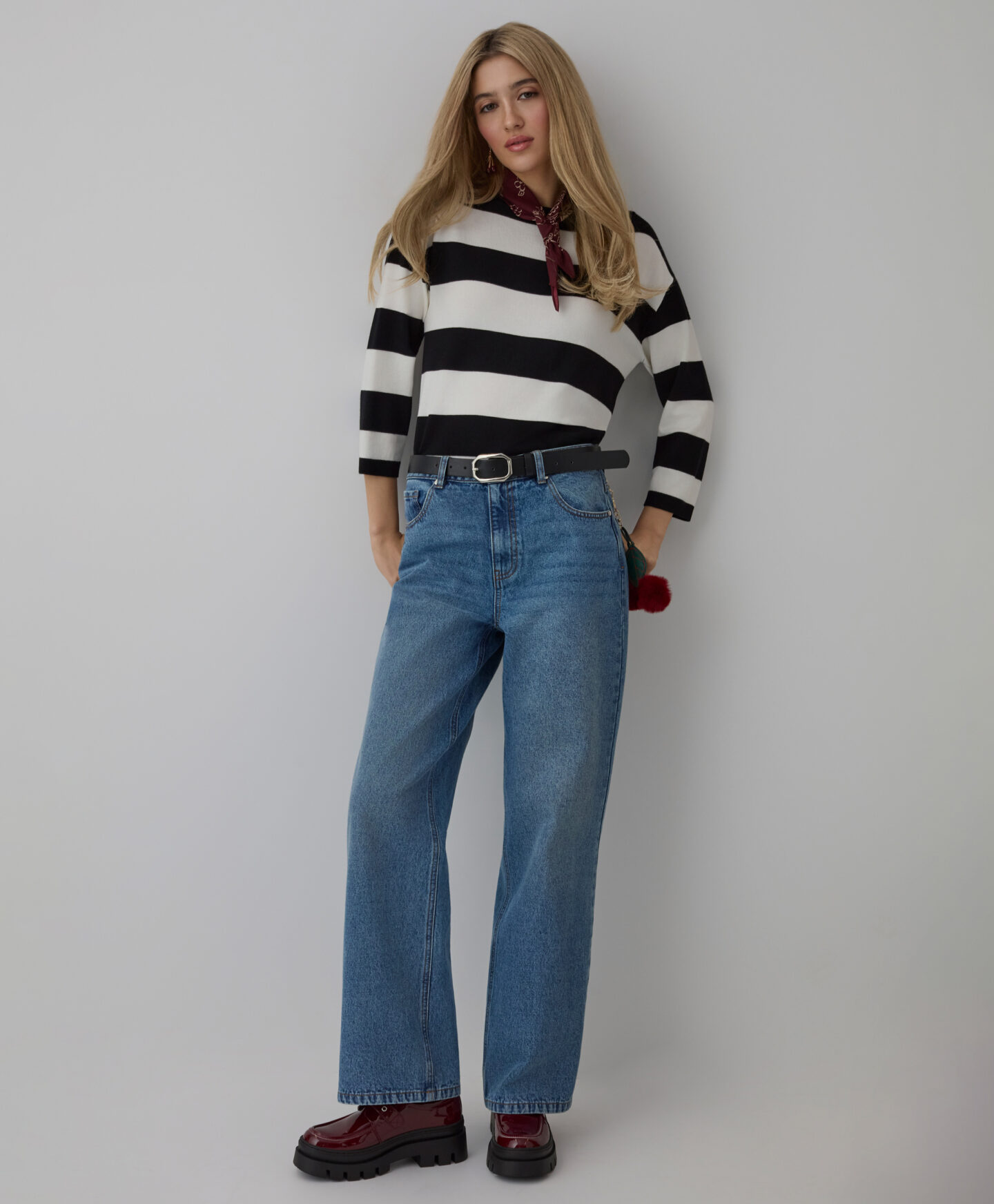 Ženski pulover s prugama ističe se jedinstvenim krojem. Dodatak viskoze čini pulover mekanim i prozračnim, pružajući udobnost tijekom cijelog dana. Kimono stil čini pulover jedinstvenim i osigurava slobodu kretanja.