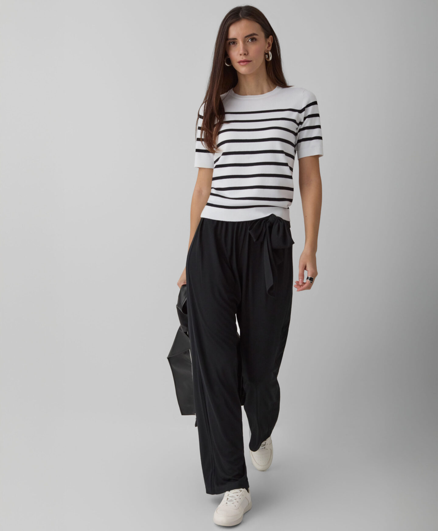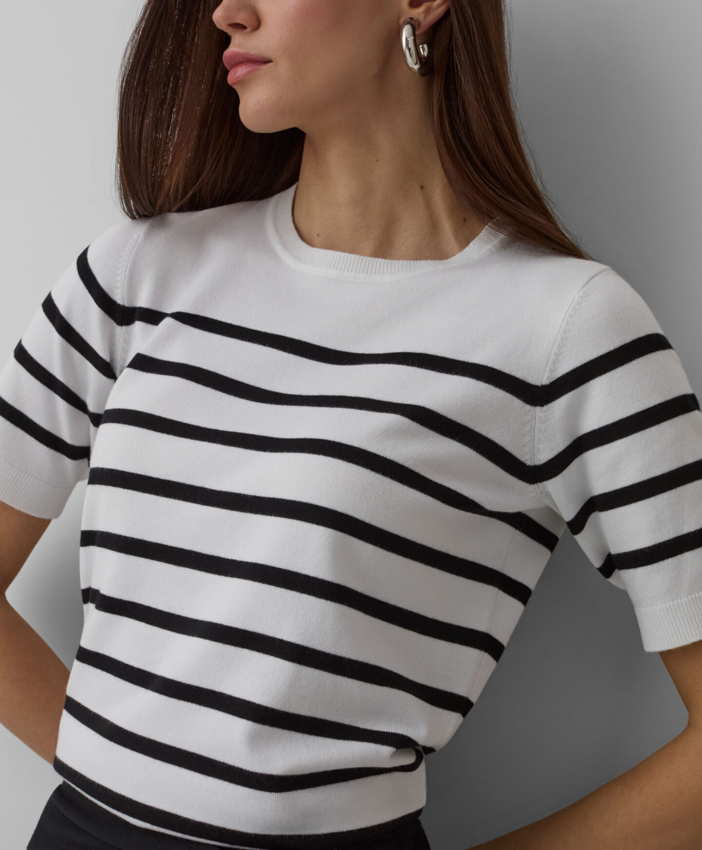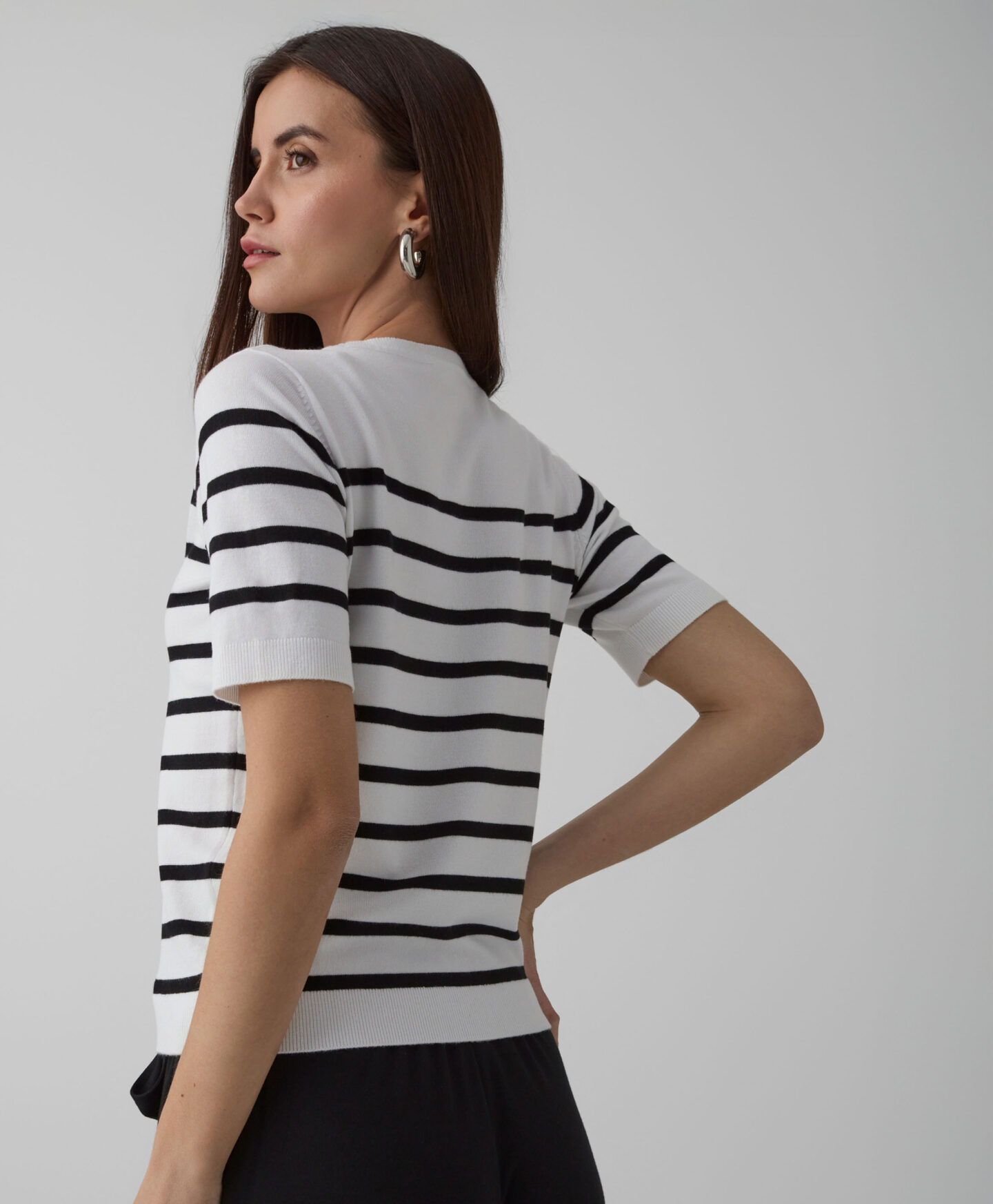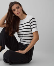Ženski pulover s prugama i kratkim rukavima neophodan je odjevni komad za svaku garderobu. Savršen je odabir za prijelazne sezone. Klasični motiv pruga odlično će pristajati uz većinu odjeće u vašem ormaru. Kratki rukavi nude brojne mogućnosti stiliziranja, a univerzalni kroj savršeno se prilagođava različitim tipovima tijela. Pulover je jednostavan za održavanje i zadržava svoju boju i oblik čak i nakon mnogo pranja.