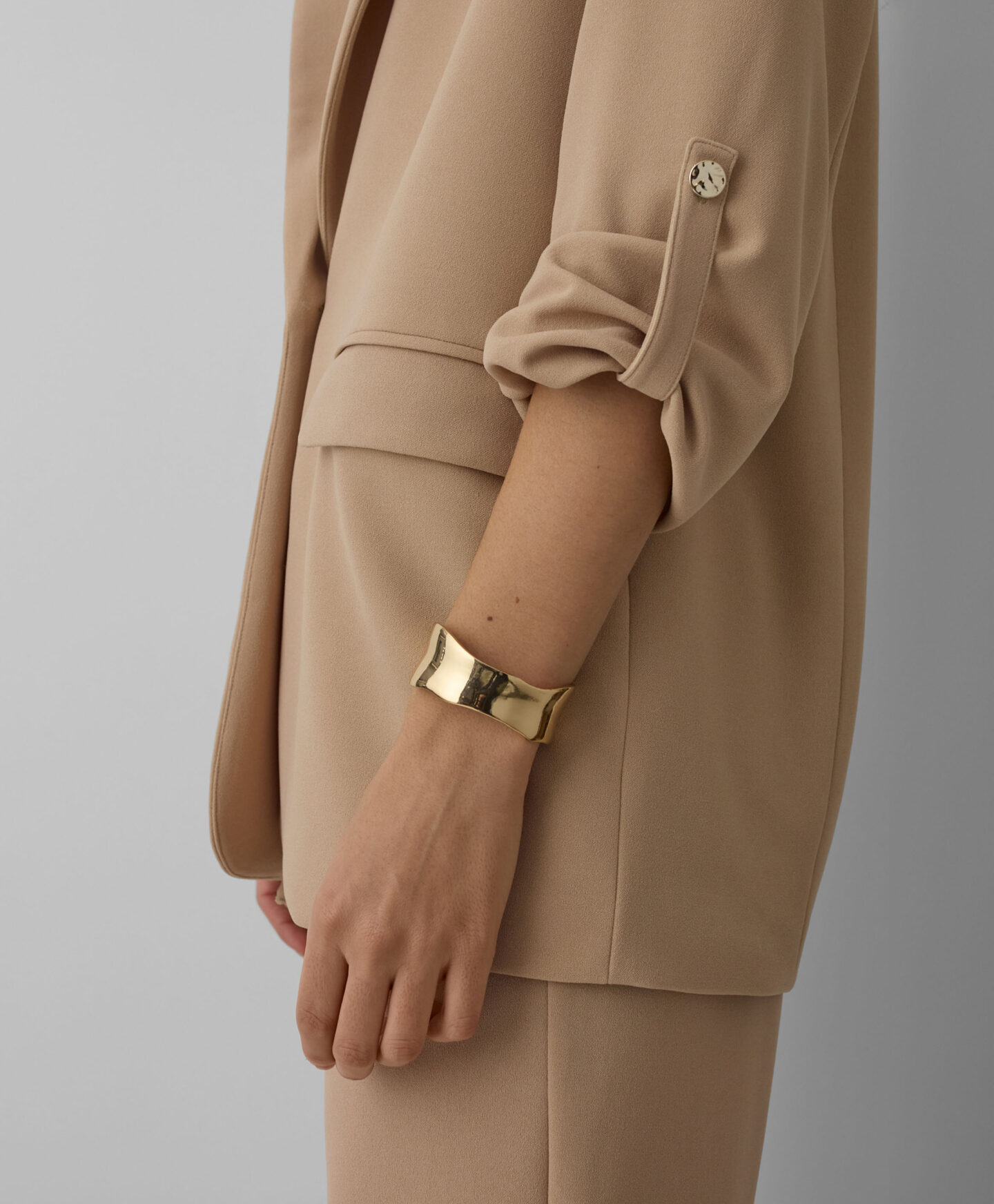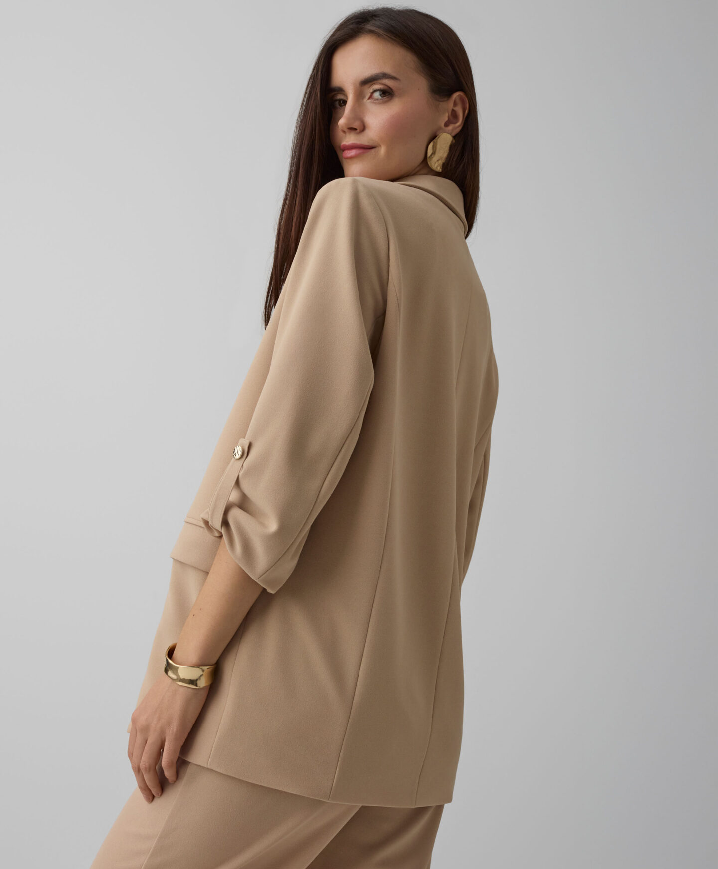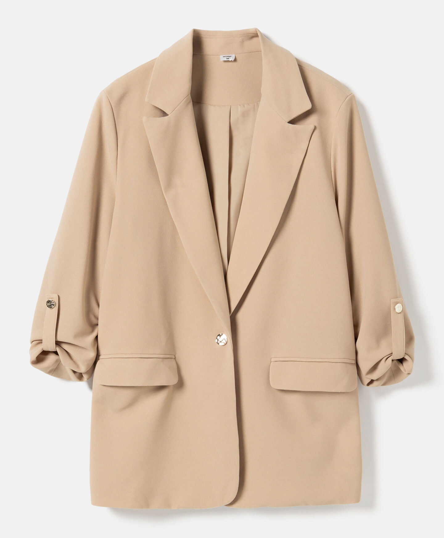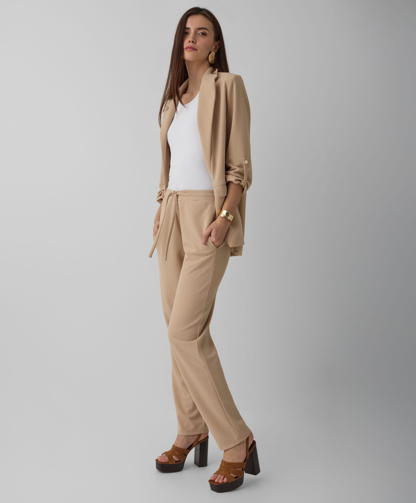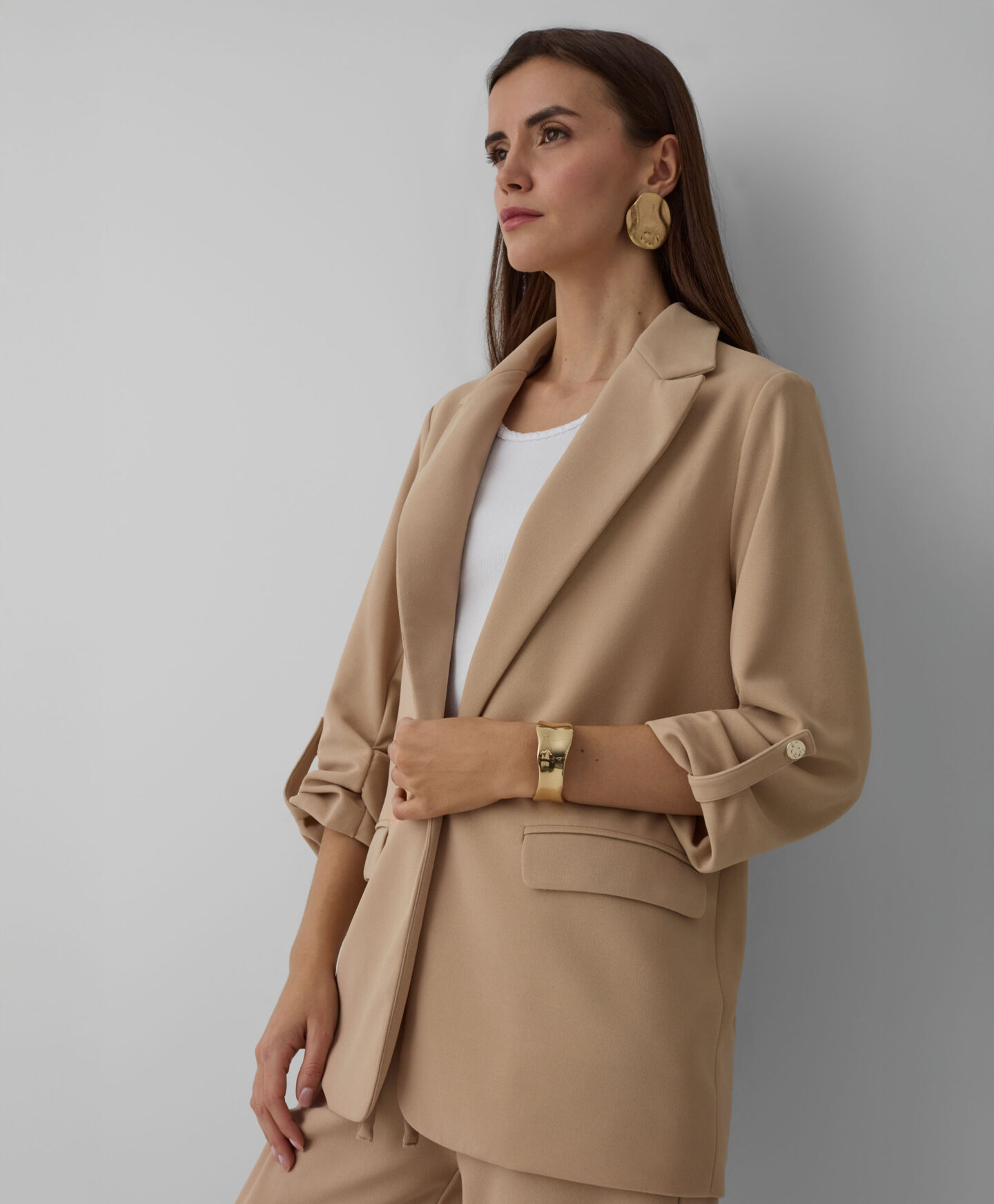 Ženski sako savršeno pristaje uz hlače iz iste kolekcije. Klasičan je odjevni komad koji morate imati u svom ormaru. Možete ga nositi preko elegantne haljine ili obične majice. Savršen je za ured, formalne sastanke ili obiteljska okupljanja. Bež boja nadopunjuje mnoge odjevne kombinacije i pruža vam potpunu slobodu stiliziranja.